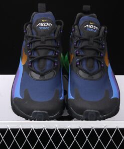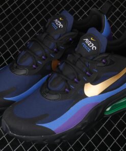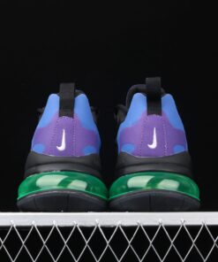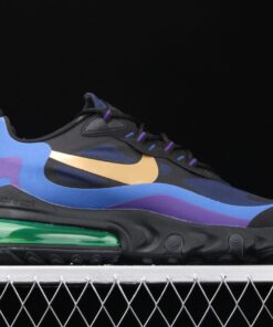 Dressed in a Black, University Gold, and Deep Royal Blue color scheme. The shoe features Deep Royal Blue hues throughout its upper paired with a lighter shade of Blue and Purple on its overlays. A Gold Swoosh logo on the sides, Neon Air Max 270 heel unit completed with a Metal-styled “Nike Air” font graphic on the insoles.