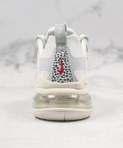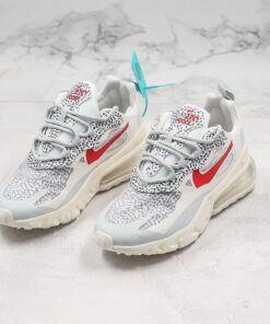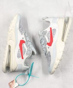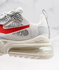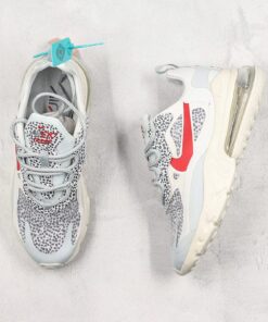This offering of the shoe features a White upper with Safari patterns on the tongues, lacestays, heels, and underlays on the translucent toe and side panels. Red contrasting accents are used on the tongue and Swoosh logo atop a White React cushioned sole.
