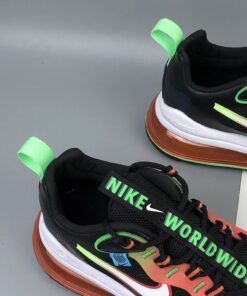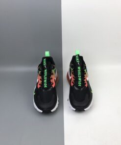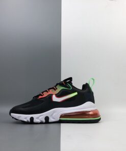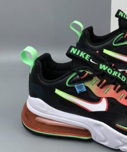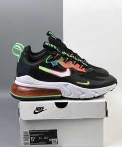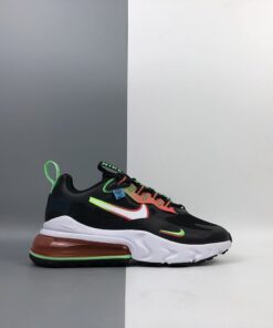 Pitch black paints the whole nylon mesh synthetic upper body, including the plastic heel support, laces, and inner lining. As a result, the flashy and summer-ready colours jump right our with bright and cheerful aesthetics. For example, the neon green, pink, red, blue, and teal shades on the Nike Swoosh outline and the eyelets. The ribbon going over the tongue shows off the green “Nike Worldwide” branding, and the Air Max 270 heel blob pops in syrup pink. Finally, crisp white on the Nike React midsole and the Swoosh complete the kaleidoscopic theme.