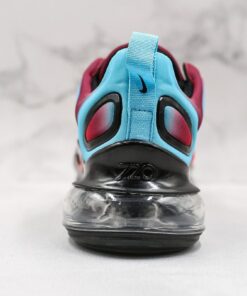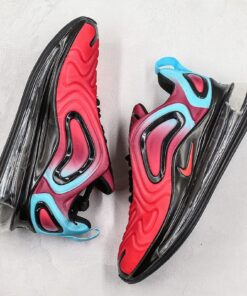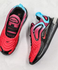 Nike’s Air Max 720 and gradient detailing certainly see eye-to-eye, as over its brief history on the market the 720 has already taken on a veritable medley of bold and colorful fades. Now, yet another pair has joined the eye-catching slate of offerings: a hot red to cool blue makeup. The toebox and forefoot are all high-temperature, but give way to a more gradual purplish red towards the midfoot before fading to chilled-out blue accents towards the collar and heel. Black trim and overlays provide further contrast, while branding is offered via an Air Max badge on the tongue and a red Swoosh on the black plastic midfoot clip. Down below, the 720’s signature bulbous cushioning unit mixes a clear bubble with red detailing, and a black outsole completes the look