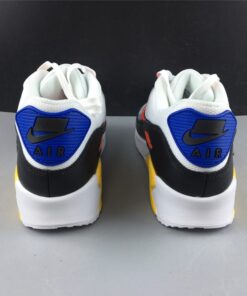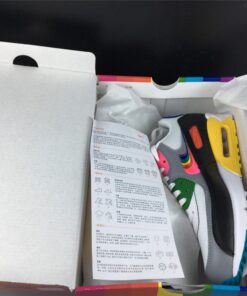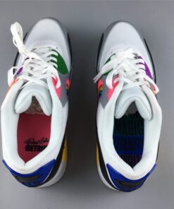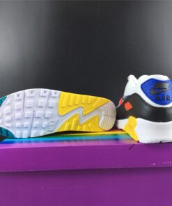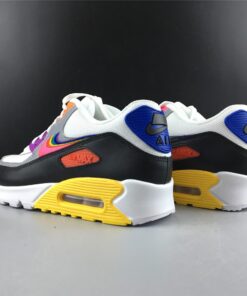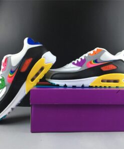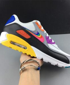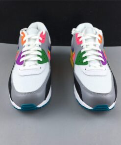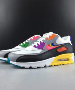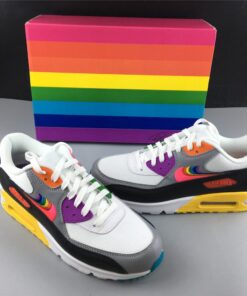 This offering of the Nike Air Max 90 features a White mesh upper with Grey and Black overlays. Highlighting the shoe is a rainbow multi-stitched Swoosh logo on the sides, along with Orange, Purple, Red, Blue, and Yellow hues on the plastic overlays.