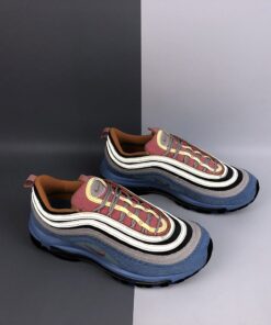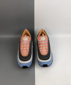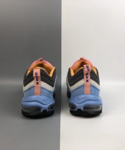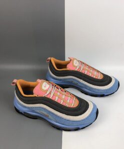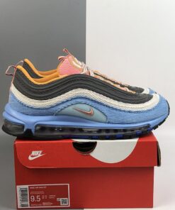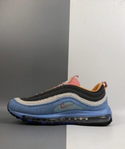 Both Air Max 97s sport a combination of Pastel Blue, Charcoal, Beige, Pink, and Orange hues. They come with 3M reflective hits on the tongue, corduroy material covering the entire upper with stitched Swooshes on the sides atop a full-length Air Max sole unit.
