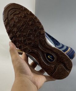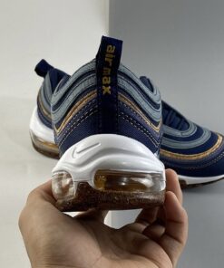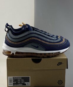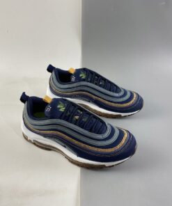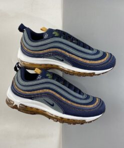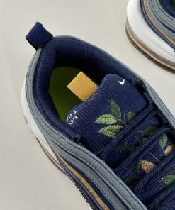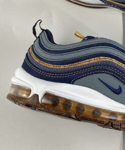 Dressed in a Hasta, Obsidian, Thunder Blue, Bucktan, White, and Wheat color scheme. This Nike Air Max 97 is made with about 20 percent recycled content, including Recycled Poly Canvas and other textiles on the uppers. The outsole is crafted from 9 percent recycled cork — partially sourced from the wine industry — infused in the rubber. This creates a natural look and feel and lowers the overall impact of that material.