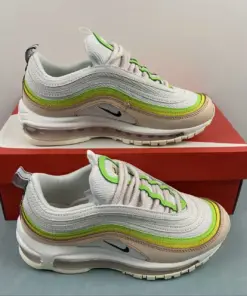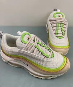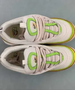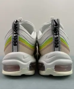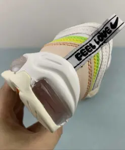 Introduced via the Air Force 1 Mid, a white corduroy base proffers a blank canvas for a multi-color treatment to ensue bearing lime green, yellow and light tan shades across the silhouette’s leather overlays. The established neon green further bears notoriety along its tongue fastener embroidered with a trio of hearts centered around a black and white Swoosh. The latter combination additionally outfits the heel’s pull tab adorned with “FEEL LOVE” text while the peach hue later fills the model’s full-length Air bubble underfoot surrounded by a clad white sole unit.