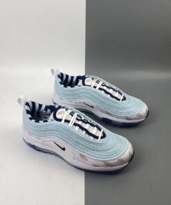 Constructed of a white upper with “Topaz Mist” paneling and “Deep Royal” accents, the sneaker features a white foam midsole and full-length Air Max unit. Paying homage to the iconic Winged Foot Golf Club in New York, an all-over print depicting flying shoes is applied in “Celestial Gold” embroidery. A striped outsole and inner sock complete the style.