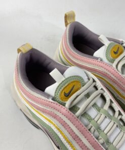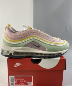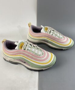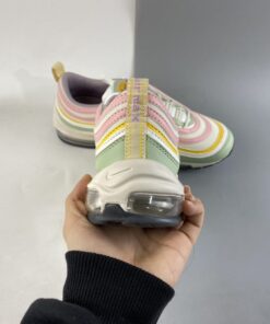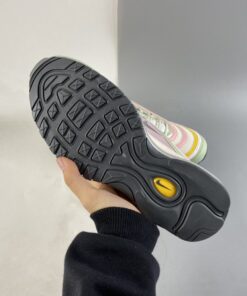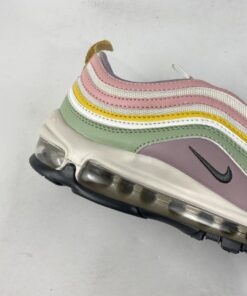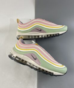 This Nike Air Max 97 features mesh across the base while pastel hues of Pink, Orange, Yellow, and Green land on the overlays. Following, Grey adorns the embroidered Swoosh that also runs across the outsole. Finally, a White midsole finishes the look.