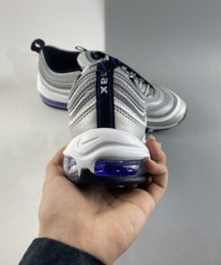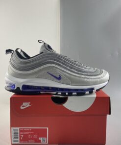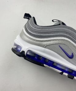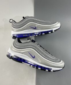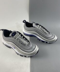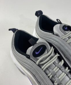 Mesh and synthetic leather overlays throughout the design from 1997 predominantly indulge in a shimmering tone, with the exception of the striping immediately above the full-length mudguard. Black enters the mix at the collar, spine and tongue label, with the latter two components also donning purple flair. Miniature swooshes on the mid-foot also indulge in the rich hue, but they’re overshadowed by the Air Max-cushioning’s all-purple makeup. What remains of the midsole indulges in simple white, which also appears throughout the iconic tread underfoot. Together, the aforementioned detailing slightly follows the aesthetic popularized by the Air Max 97/BW “Persian Violet”.