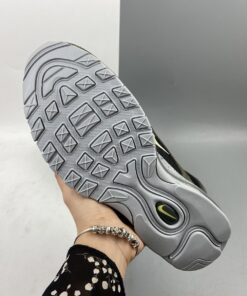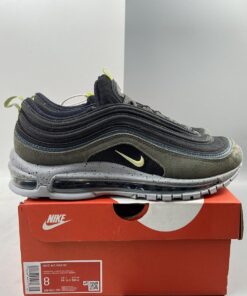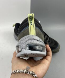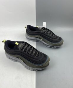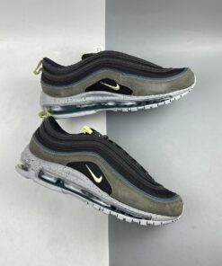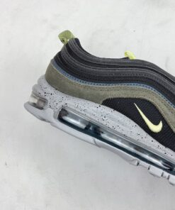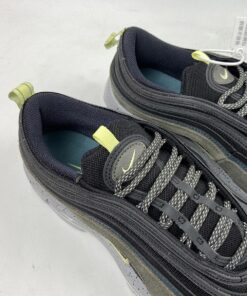 This offering of the Nike Air Max 97 features a Black mesh base with leather and suede overlays in a Slate Blue and Olive hue, respectively. Volt Yellow accents, 3M reflective detailing atop a speckled midsole completes the design.