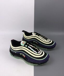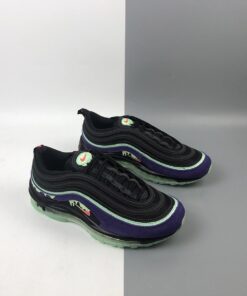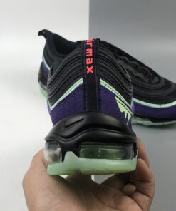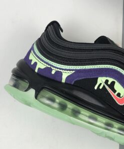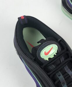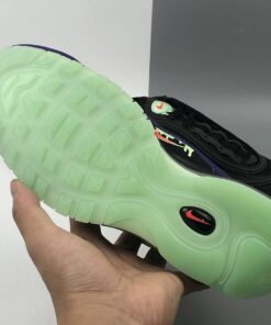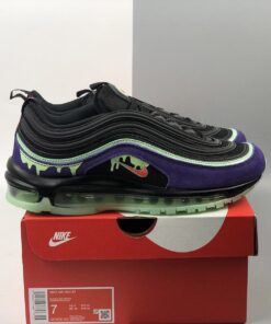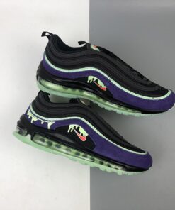 Looking closer, this Nike Air Max 97 utilizes Black mesh on the base while Purple suede lands on the mudguard. Following, we have Slime Green dripping on the side panels while the shade also wraps the entire shoes and within the Air Max unit. Lastly, other details include 3M reflective, iridescent on the tongue, and a glow in the dark rubber outsole.