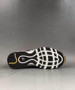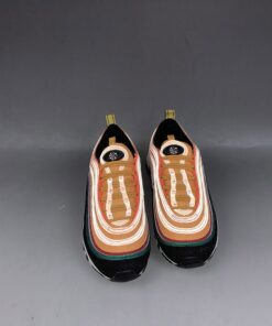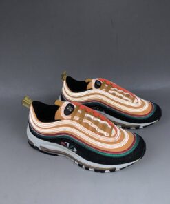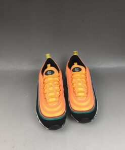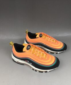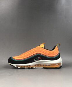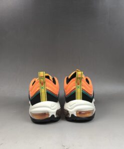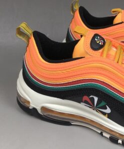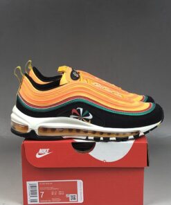 Dressed in a Black, University Gold, and Lucid Green color scheme. This Nike Air Max 97 features a Golden Yellow upper paired with Orange, Red, and Green tones on its wavy overlays. Black textured mudguards atop a White midsole, Yellow Air units, Black and White outsole and the Sunburst logo on the sides, insoles, and outsole completes the design.