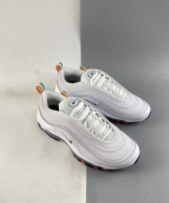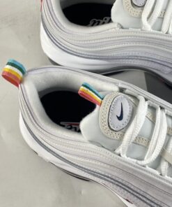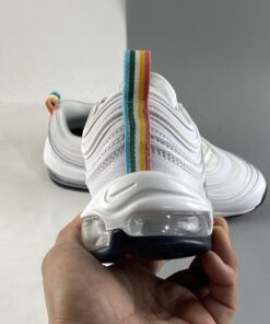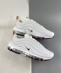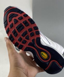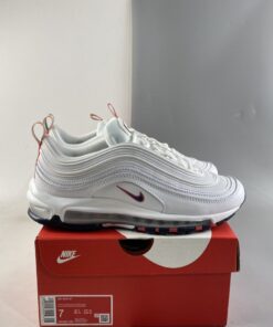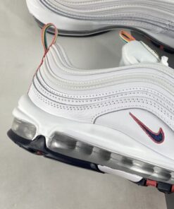 This offering of the Air Max 97 features an all-White leather base with Navy embroidered Swooshes that are outlined in Red on both lateral and medial sides. Multi-Color pull tabs on the tongues and heels atop a Navy and Red rubber outsole completes the design.