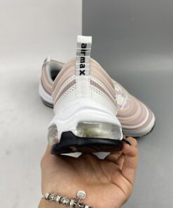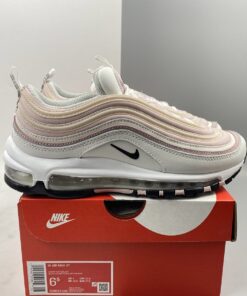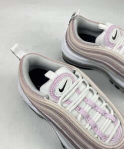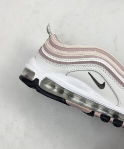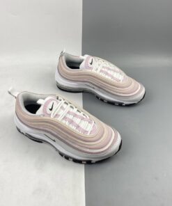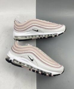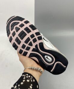 This offering of the Nike Air Max 97 features Pink mesh uppers with Cream overlays and White leather mudguards. Black Swooshes and heel branding atop a White midsole and Black/Pink rubber outsole completes the design.