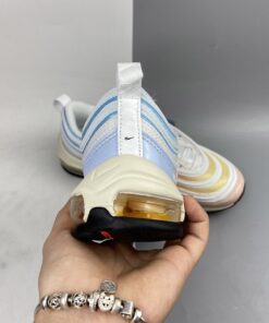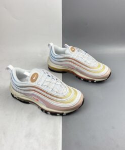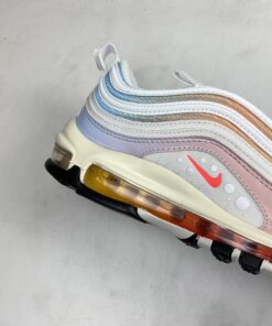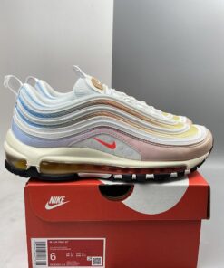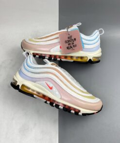 This women’s iteration of the Nike Air Max 97 is inspired by the sky lantern and features a Sail, Infrared, and White color combination. Next, the pair features a Red to Orange gradient across the Air Max unit. In addition, gradient detailing covers the base that starts out in Yellow and ends in Blue. Following, 3M reflective wraps the shoes, multi-color adorns the tongue labels, and ‘The Future is in the Air’ branding hits the left heel pull tab to finish the look.