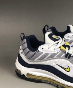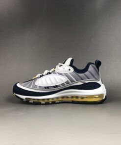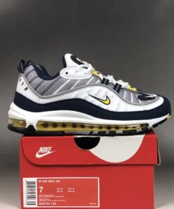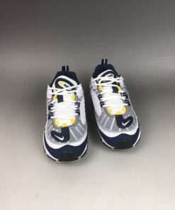 This Nike Air Max 98 comes in original form while dressed in a White, Tour Yellow, Midnight Navy and Cement Grey color combination. White on the midsole and Black on the outsole completes the look.