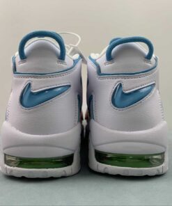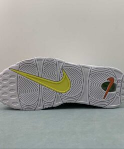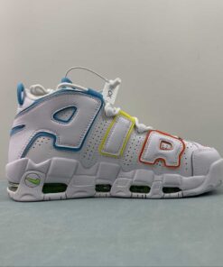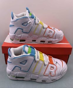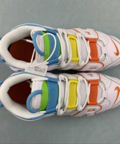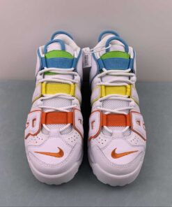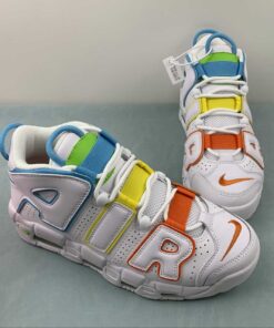 This Nike Air More Uptempo comes with White leather across the base, mesh tongues, and perforations across the panels. Highlighting the shoes are Orange, Yellow, Blue, and Green shades that outline the large ‘AIR’ branding on the panels, elastic straps, pulls tabs, insoles, and Air unit. Lastly, a White rubber sole finishes the look.