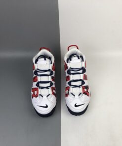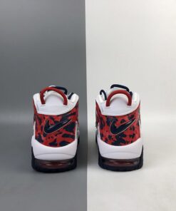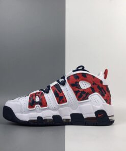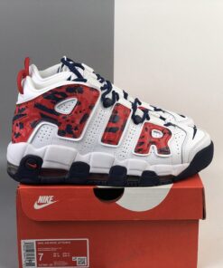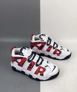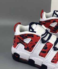 This Nike Air More Uptempo features a patriotic theme while utilizing White leather on the upper, mesh tongues and the traditional perforations on the panels. Following we have both Red and Navy accents while a camo like print is used on the large ‘AIR’ branding. Finishing the look is a Navy rubber outsole.