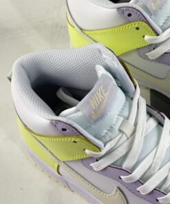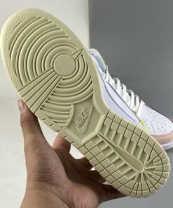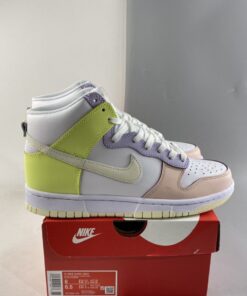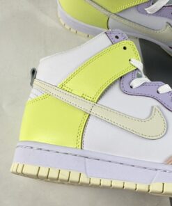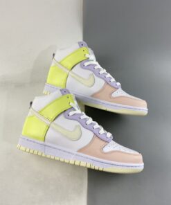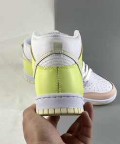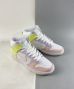 Dressed in a White, Cashmere, and Lemon Twist color scheme. This Nike Dunk High features a White leather base with pastel hues covering the overlays, Swoosh logos, and rubber outsole. White continues on the laces, tongue, liner, and midsole to complete the design.