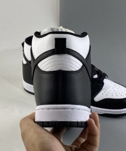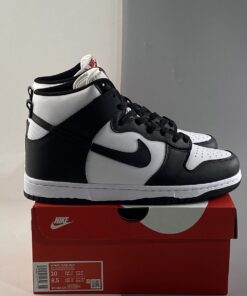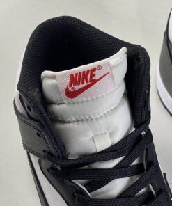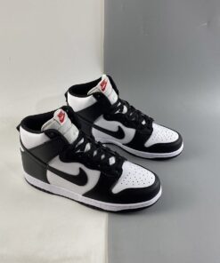 Dressed in a White, Black, and University Red color scheme. This Nike Dunk High features a White leather upper with Black Swooshes, overlays, laces, lining, and rubber outsole. A White midsole with University Red tongue tags completes the design.