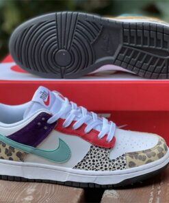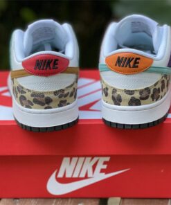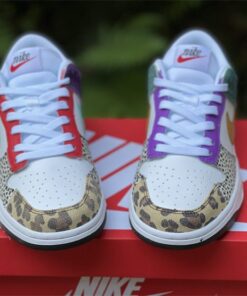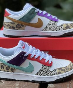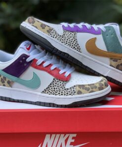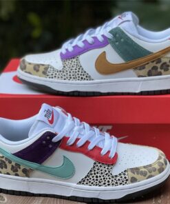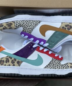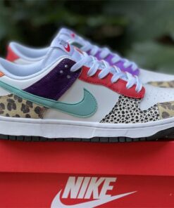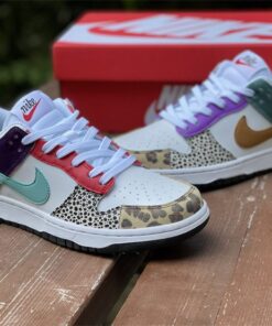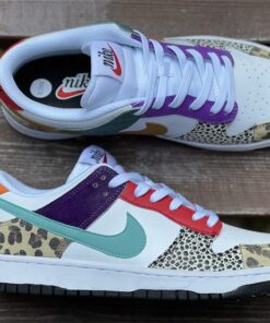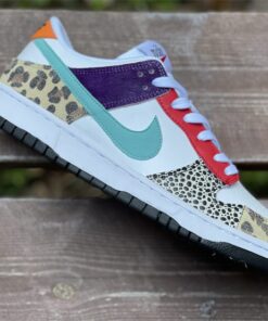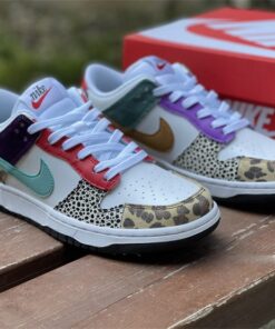 Going over this Nike Dunk Low, it features White leather on the base while utilizing a mixture of safari prints on the overlays. Included are faux furs, leopard print, safari, and mismatched Swooshes. Other details include White on the midsole, a Black rubber outsole, and each pair comes with an extra set of Black laces.