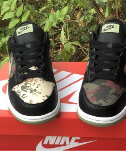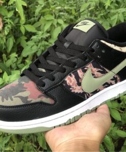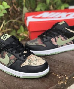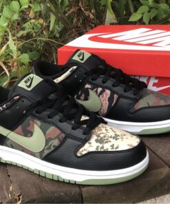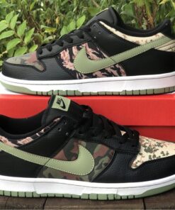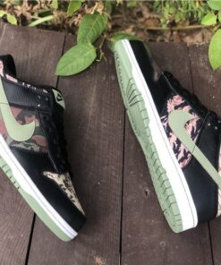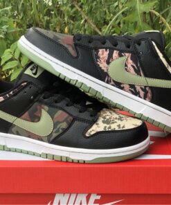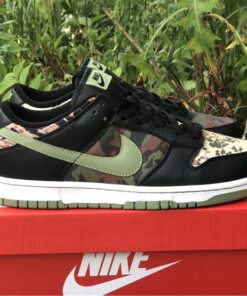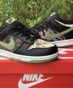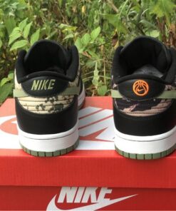Dressed in a Black, Oil Green, White, and Total Orange color scheme. This Nike Dunk Low features multiple camo prints used as its base with Black nubuck overlays. Oil Green appears on the Swoosh, tongue tag, lace tips, and outsole. Other details includes a Green “NIKE” embroidery on the left heel, while the right features a basketball logo in Orange. A White midsole with Orange branding on the insoles completes the design.