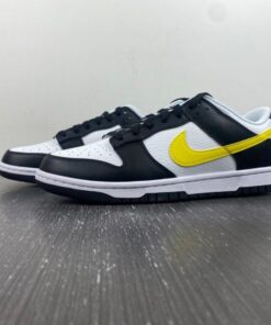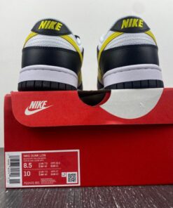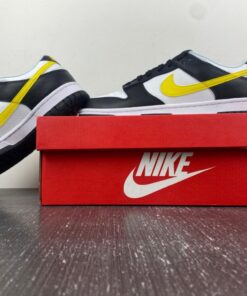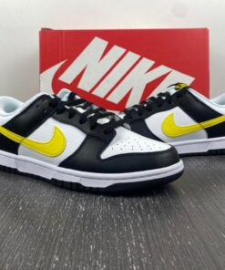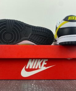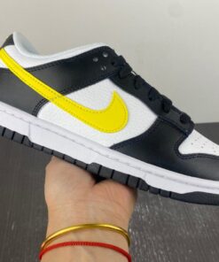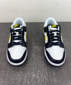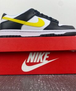 This Nike Dunk Low comes dressed in a Black, Yellow, and White color combination. Utilizing White tumbled leather on the upper and Black smooth leather on the overlays. Standing out, we have Yellow used on the Swoosh logos across the panels, tongue labels, and embroidered Nike on the heels. Next, White lands on the tongues, liner, and midsole, while Black on the laces and rubber outsole finishes the look.