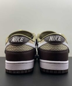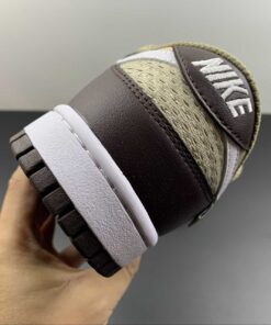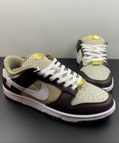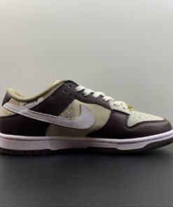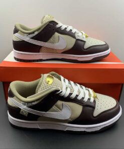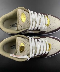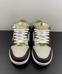 Far from the first Nike Sportswear proposition to get “blinged” out, the newly-surfaced pair indulges in one of the Nike Dunk‘s most haphazard arrangements, both in material choice and design layout. Synthetic leather, ripstop nylon and mesh come together across the sneaker’s upper, with base layers donning a light brown tone. A dark chocolate-reminiscent hue lands atop the aforementioned base, while profile swooshes, laces and branding on the spine opt for a simple white look. Shimmering gold enters the mix through the “NIKE” lace dubraes and swoosh-accompanied emblem at the top of the tongue. Non-standard tags land on the profiles, too, adding to the model’s decades-old legacy.