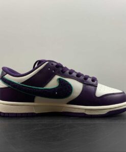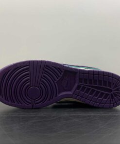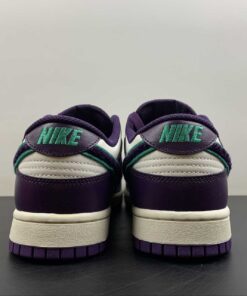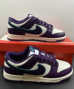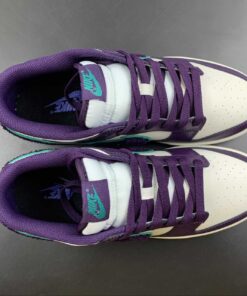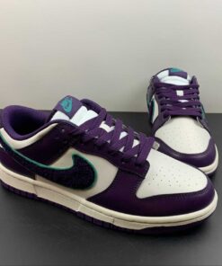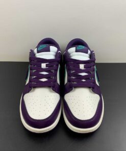Dressed in a Sail, Grand Purple, and Neptune Green color scheme. This offering of the Nike Dunk Low features a White leather base with Purple leather overlays highlighted with Aqua contrasting accents throughout. Chenille Swooshes on the sides atop a Sail midsole and Purple rubber outsole completes the design.