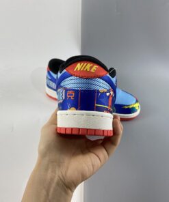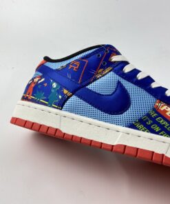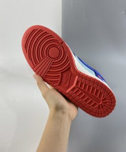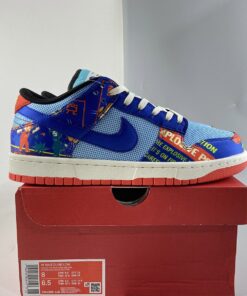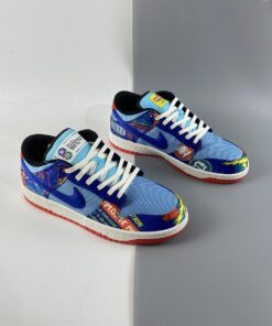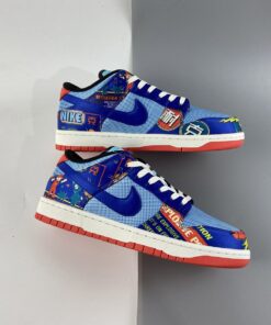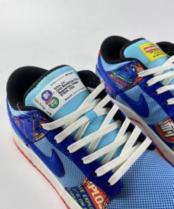 this Nike Dunk Low comes with a layered upper that’s inspired by the packaging from firecrackers. Furthermore, the pair features wrinkle paper textures, warning label print, and fuse-like laces. Next, Blue leather lands on the midsole, and Light Blue mesh adorns the panels, toe, and tongue. Finally, a White midsole and a Red rubber outsole finish the look.