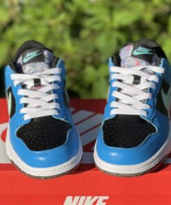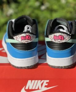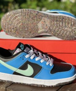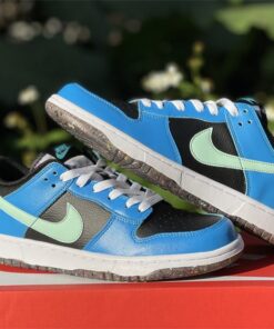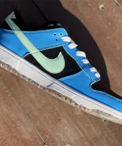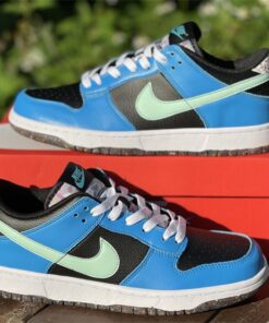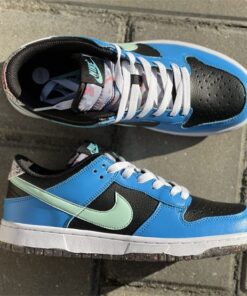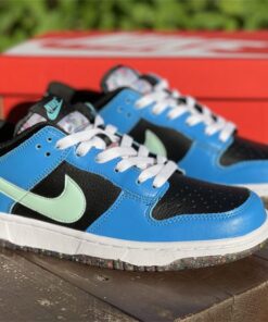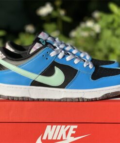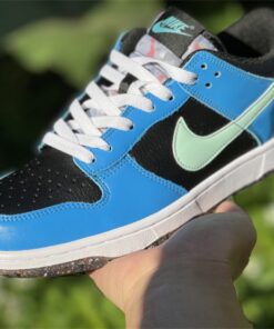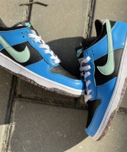 This offering of the Nike Dunk Low features a Black tumbled leather base with Blue overlays and Light Green Swooshes. Additional details includes White laces and midsole with playful “Nike” branding in the rear. Grind Rubber at the heel overlays and full-length outsole completes the design.