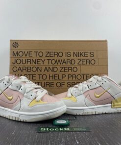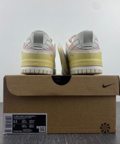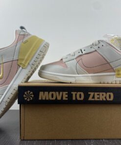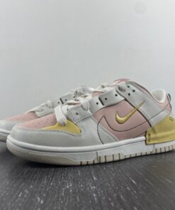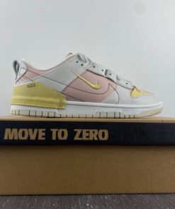 This offering of the Nike Dunk Low Disrupt 2 features a Pink leather base with White overlays highlighted with Pastel Yellow contrasting accents. Stitched Swooshes, graphic insoles atop a two-tone Grin Rubber outsole completes the design.