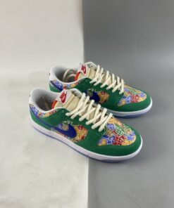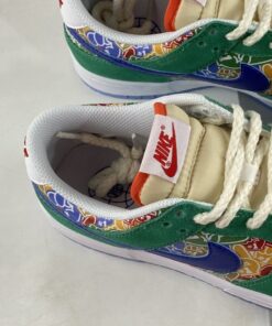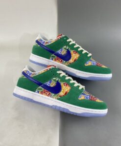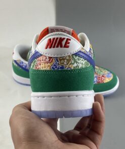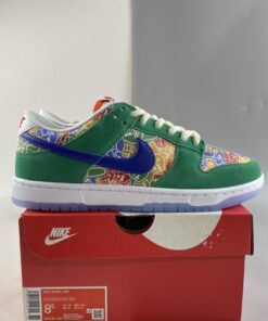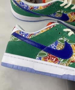 Dressed in a Stadium God, Old Royal, White, and University Red colors scheme. This offering of the Nike Dunk Low features a leather base fully covered in multiple-colored foam fingers paired with Green suede overlays. Blue Swooshes, Red tongue and heel braiding, rope laces atop a White midsole and icy translucent outsole completes the design.