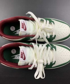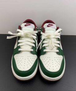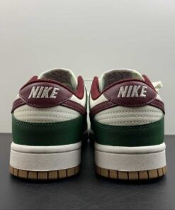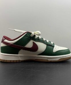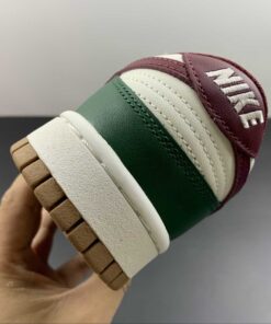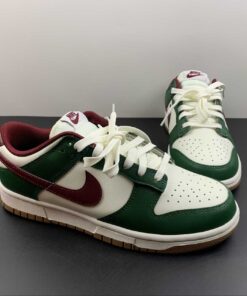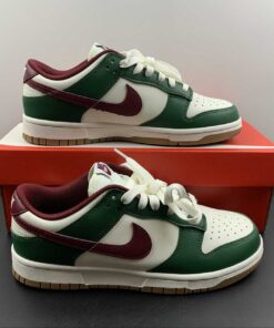 Relative to Nike’s usual festivities, whose palettes are typically vivid, this Dunk Low opts for a much darker look. Leaning towards the more muted end of the spectrum, the above-mentioned hues are used throughout the upper. Greens wrap the white base by way of the overlays, while red pops across the lining, Swoosh, and heel tab. And beyond the tongue, laces, and midsole — which match said neutral — the sole unit is fitted with a gum bottom.