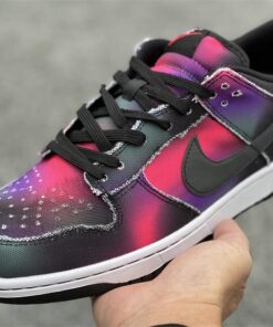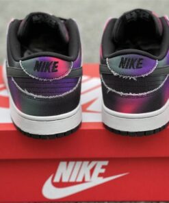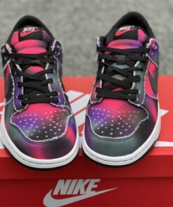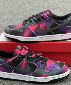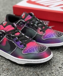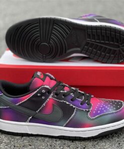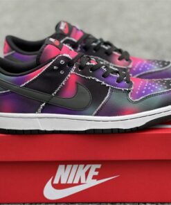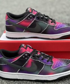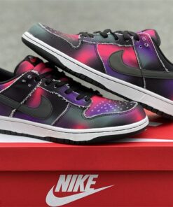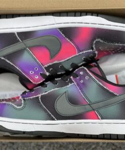 The pairs feature textile uppers dressed in a pink and purple color blocking. The bold black collar, laces, and swooshes frame the design, with the latter also boasting a reflective coating that flashes up in the dark. Lastly, solid two-tone outsoles in black and white with graffiti prints on the sockliners complete the design.