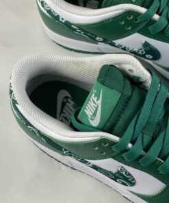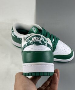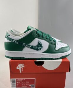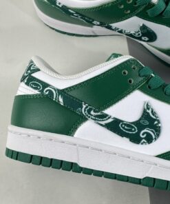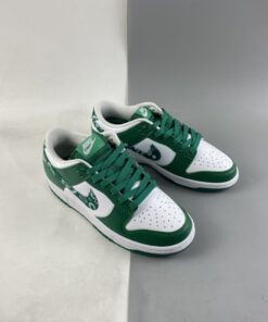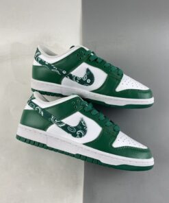 This Nike Dunk Low features a clean and simple two-tone makeup as the shoe starts off with a smooth White leather base which is then contrasted by Green leather overlays. the defining feature is the green and white paisley print that covers the Swooshes as the side panels as well as the heel tabs. To wrap up the design we see whiter inner liners and midsoles and green detailing on the tongues, laces, and rubber outsoles.