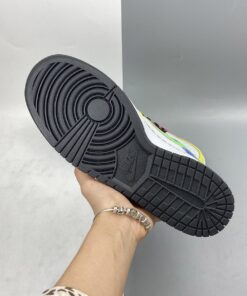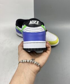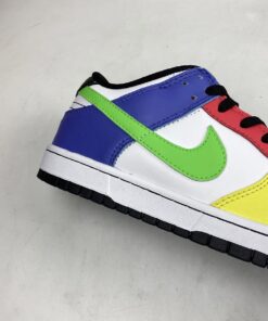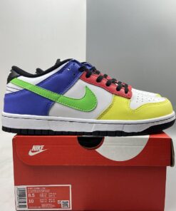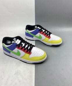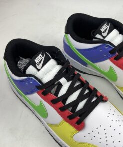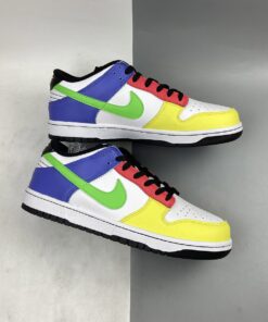 Going over this Nike Dunk Low, it features White leather on the base while Multicolor shades of Yellow, Green, Red, and Purple appear on the overlays. Next, Black adorns the laces, liner, tongue labels, heel, and rubber outsole. Finally, we have Volt on the insoles with White on the tongue and heel branding and a White midsole.