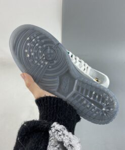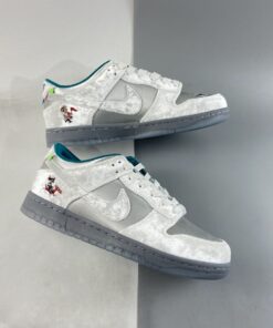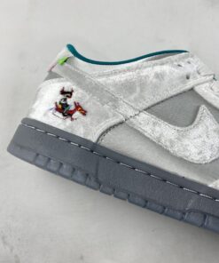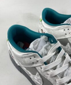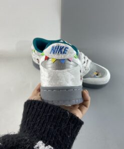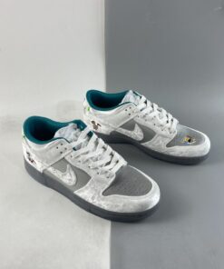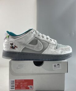 This Nike Dunk Low comes highlighted with Matte Silver on the base, while White velvet adorns the overlays. Adding pop, Teal covers the liner, and White fur covers the tongue. A splash of colors land on the heel that forms a pattern typically worn by medieval jokesters. Next, we have kids playing in the snow with a sled while a kanji lands on the insoles that translate to ‘Ice.’ Lastly, we have a Grey midsole and a translucent outsole with snowflakes.