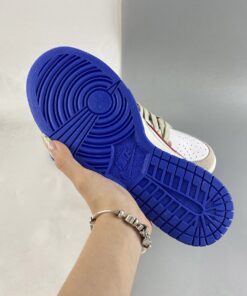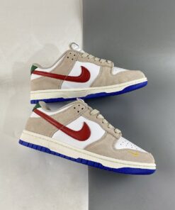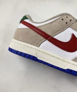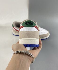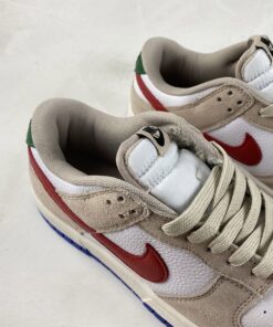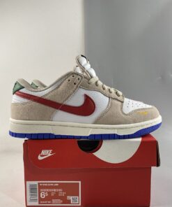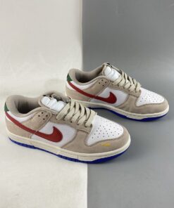 the low-top Nike Dunk emerged in a predominantly “Light Iron Ore” and “White” colorway, with the former tone arriving exclusively via the suede overlays found across the upper. Tumbled leather bases, then, favor the “colorless” hue, allowing accompanying “University Red” and green flair that appears at the profile swooshes and upper heel panel, respectively, to revel in the spotlight. Non-standard miniature swooshes at the lateral forefoot introduce a golden yellow into the mix, while the Air Jordan 1-reminiscent sole units underfoot round out the ensemble with tread clad in a vibrant blue.