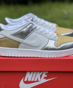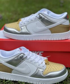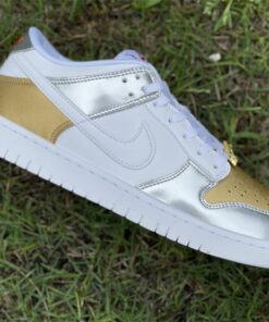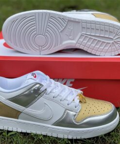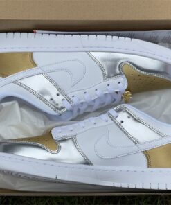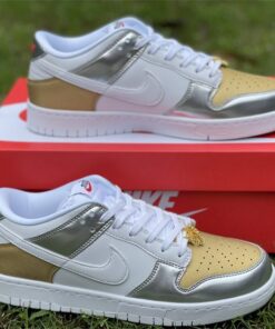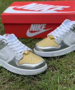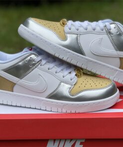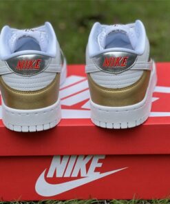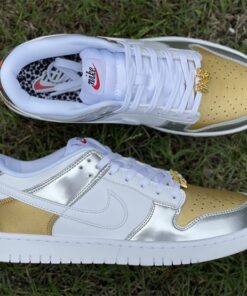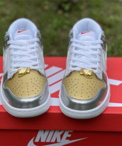 With white leathers hosting gold toes and heels, as well at silver toe caps, upper eyestays, and heel overlays, you’ve already got a fairly intriguing release. Add to that white-on-white Swooshes, laces, tongues, liners, and soles, and you’ve got a striking and unique mix of color. Then there’s rice red branding at the heel and tongue, stylized Nike dubraes — complete with chain links — and safari-print insoles that all add up to one of the most left-field Dunk drops of the past 18 months.