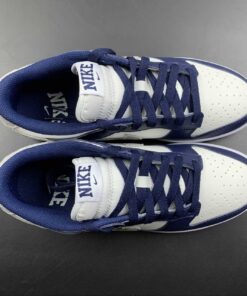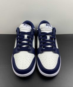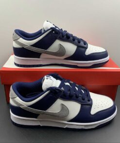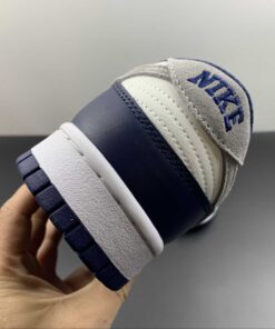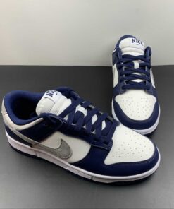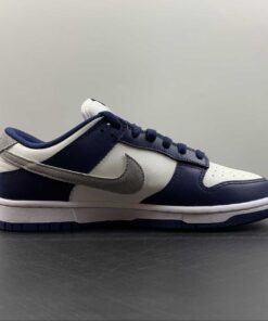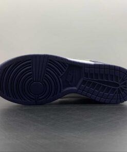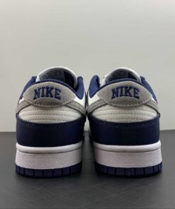 Dressed in a Midnight Navy, Light Smoke Grey, and Summit White color scheme. This offering of the Nike Dunk Low features a Sail tumbled leather base with Navy smooth leather overlays and Grey suede Swooshes. A two-tone rubber sole completes the design.