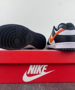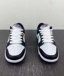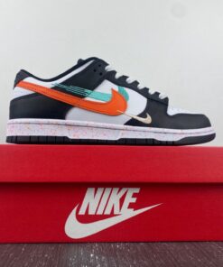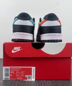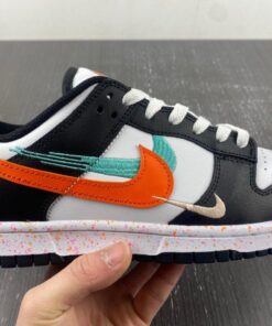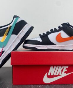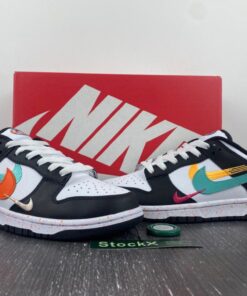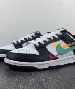 this edition of the Dunk follows many of its key components, namely its strong use of color and its decorative embroidered Swooshes. Here, though, the Dunk delivered significantly more Check marks in alternate blocking from foot to foot. You’ll find Swooshes of teal, gold, red, orange, and pink across both left and right feet, colors that then converge on the splattered midsole paintwork. Of course, this is all the more noticeable given the pair’s minimal two-tone “Panda” blocking, which it rests upon.
