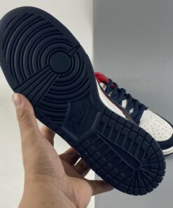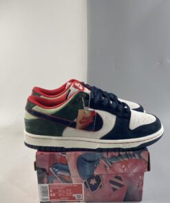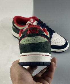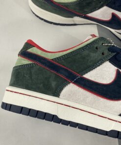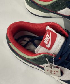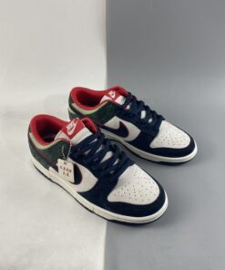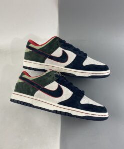 This offering of the Nike Dunk Low features a White leather upper paired with Navy and Green suede overlays. Highlighting the shoe are Red contrasting accents throughout and stitching along the White midsole atop a Navy rubber outsole to complete the design.