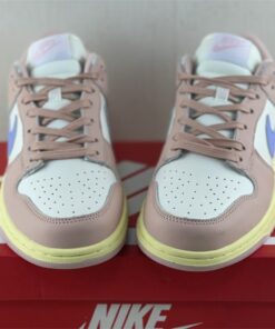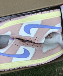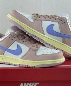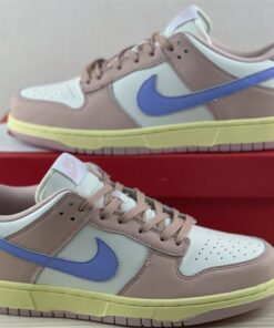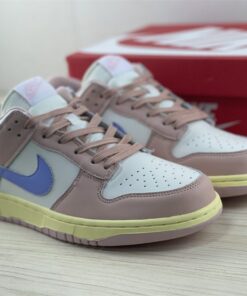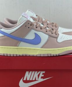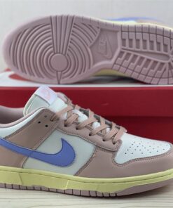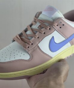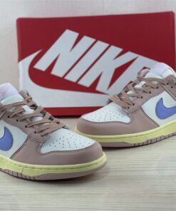 Done in an official color makeup of Pink Oxford, Light Thistle, and Phantom, this Nike Dunk Low features a full leather build on the upper with White noted on the base and a soft pink placed on the overlays. Additional details include purple accents on the Swooshes and insole branding, an aged yellow midsole, and a pink rubber outsole.