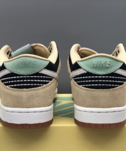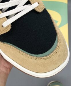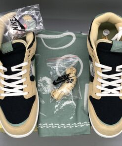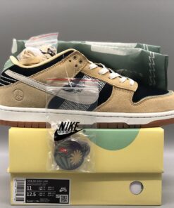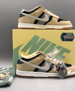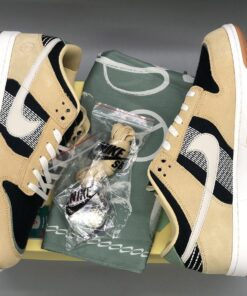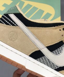 This Nike Dunk Low comes dressed in a Pale Vanilla, Sail, Black, and Silver Pine color combination. Constructed with Black denim across the upper while White Sashiko-like stitching hits the panels and heel. Next, Beige suede lands on the overlays, White leather covers the Swoosh logos, and Pine Green on the tongue labels, heel, and insoles. Sticking out, we have a peace symbol with roots on the lateral side by the heel.