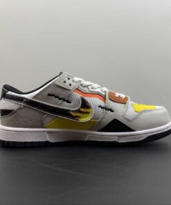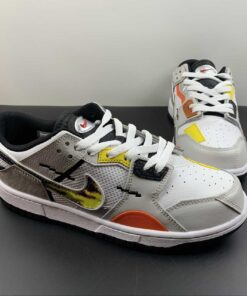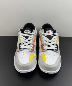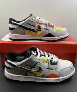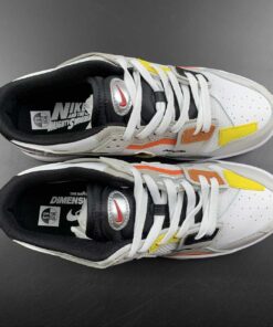 The capsule has previously included pairs of the Air Jordan 1 Low, though the latest addition to the collection indulges in the lineup’s most experimental arrangement yet. For starters, the sneaker’s Scrap iteration boasts a number of haphazardly-shaped overlays across the upper, which features a mesh base that deviates from Peter Moore’s original 1985 design. A predominantly off-white color combination is complimented by bold hits of orange and yellow, with the latter tone landing on a flame-like detail on the profile swooshes. Digi-like panels also appear on the “NIKE”-branded upper heel panels. Lastly, each shoe’s sock-liner includes text nodding to “The Mighty Swooshers” and the latest installment in the collection: “The Battle of Dimension Six.”