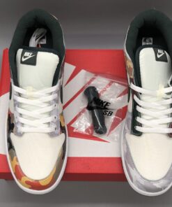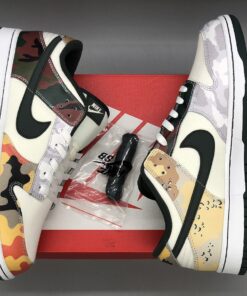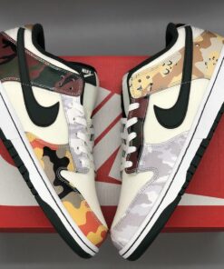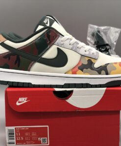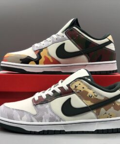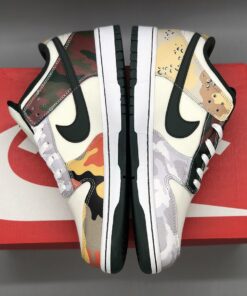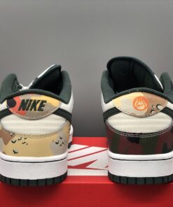 As you can infer by its moniker, there’s several camouflage patterns that take the stage here. On the right foot, woodland graphics split between forest green and burgundy for the heel overlays and orange, yellow, gray and black in the forefoot. The left side deviates with beige desert chip patterns for the rear while the forefoot region opts for a winterized white and gray camo combination. Elsewhere on these adventurous shoes, you’ll find the quarters, toe boxes and collars outfitted in white while the tongues and Swooshes are swamped in a forest green. Heel branding also alternates between the customary Nike branding on the left and an orange basketball logo on the right.
