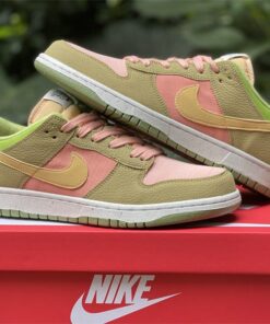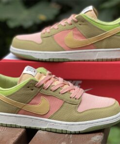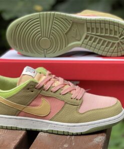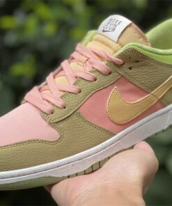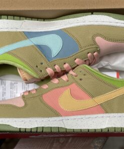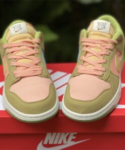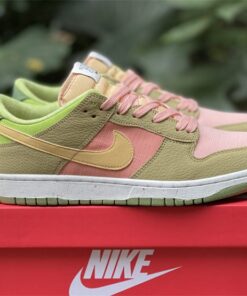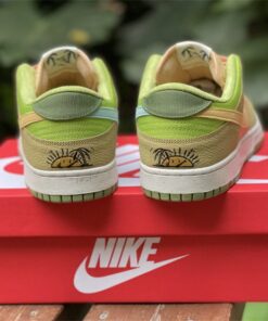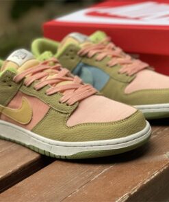 Further back, the lush palette continues with lime green dominating the heel. Mocha tumbled leather overlays, lemon-yellow Swooshes, pink laces, and a smiling sun Nike logo at the heel complete the joyful vibe of the design. Finally, tying everything together is a pastel green outsole.