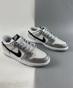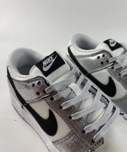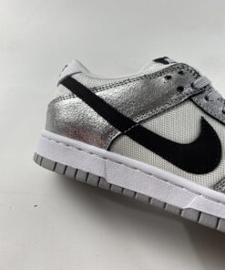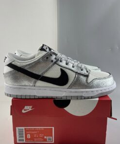 This offering of the Nike Dunk Low features a White mesh upper with Metallic Silver cracked leather overlays. Black detailing appears on the Swooshes, tongue and heel branding and insole while having Grey laces and rubber soles atop a White midsole to complete the design.