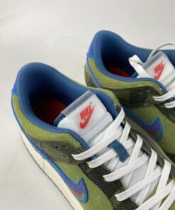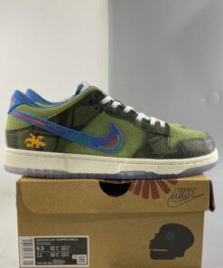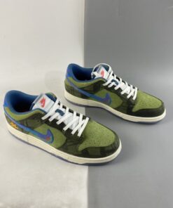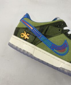 The upper uses a green faux lizard skin with black faux snakeskin on the overlays. Slate blue is seen on the Swoosh, heeltab, and liner with the Swoosh and heeltab detailed with intricate ornaments. An orange lizard is seen on the lateral heel with a white midsole and translucent outsole finishing off the sneaker.