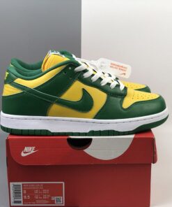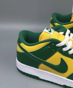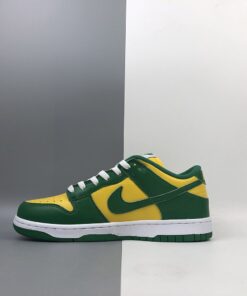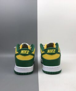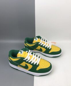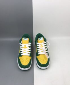 Dressed in a Varsity Maize, Pine Green, and White color scheme. This Nike Dunk Low features a Yellow base with Green overlays paired with White laces and midsole atop a Green rubber outsole.