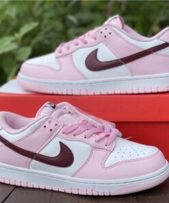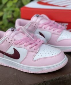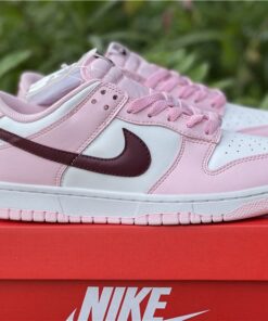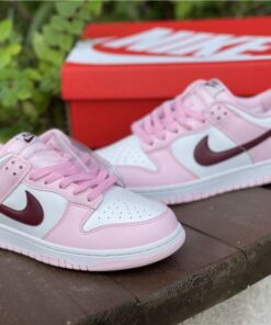 the two-toned look turns to three, with deep red, almost purple-likes shades marking the Swoosh, heel tab, and complementing branding. Underneath, the pair keeps its most classic color blocking, laying a foundation of neutral white leathers underneath numerous pink overlays. The laces, tread, and lining follow suit as per usual, completing a rather late — or early depending on your perspective — nod to the day of romance.